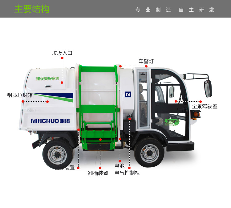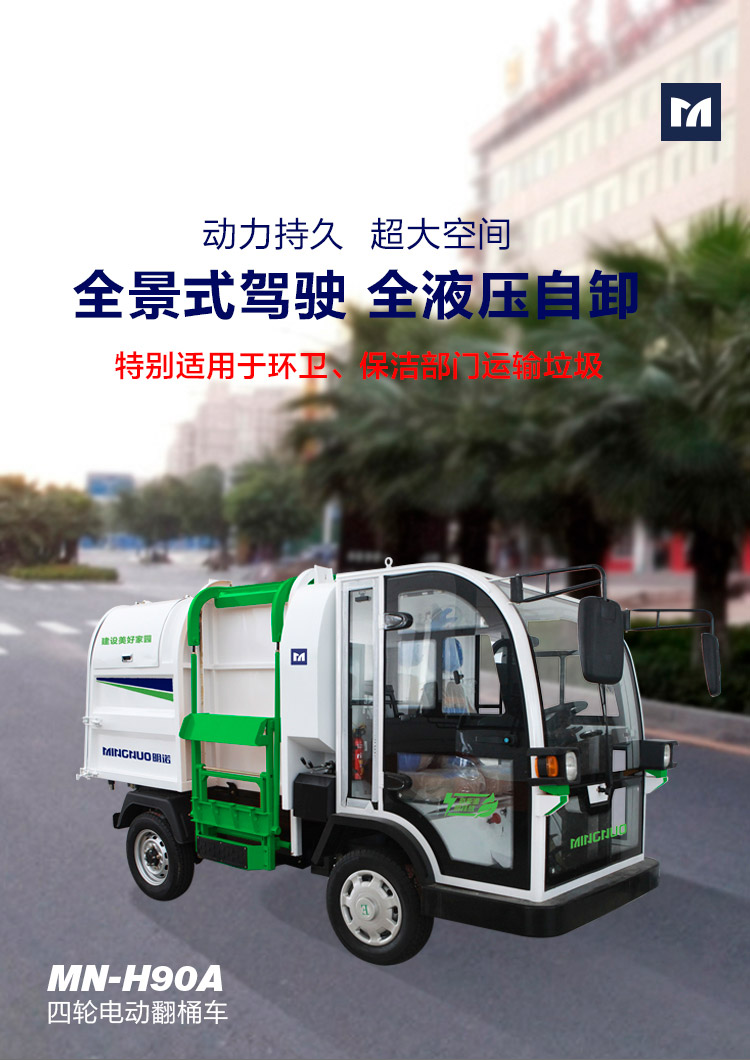 MN-H90A自装卸式垃圾车,采用明诺独特的全景式驾驶室和全液压自卸系统,是环卫、保洁部门运输垃圾的畅销车型。